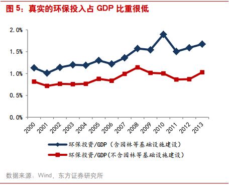 1.高估了的環(huán)保投資,行業(yè)規(guī)模仍較小 對于環(huán)保產(chǎn)業(yè),投資者一直存在一個疑問:官方口徑的投資力度很大,但從企業(yè)端看,規(guī)模卻很小,業(yè)績平淡。本質(zhì)上原因是我們的環(huán)保投入統(tǒng)計口徑問題,實際投入確實很小。按照世界慣例,環(huán)保投入需占當?shù)谿DP的2-3%,方能保障環(huán)境污染不再加劇,而之前20多年我們的環(huán)保投入長期保持在1%以下。剔除園林投入后,“十二五”的年環(huán)境治理投入僅在4000-5000億元。
