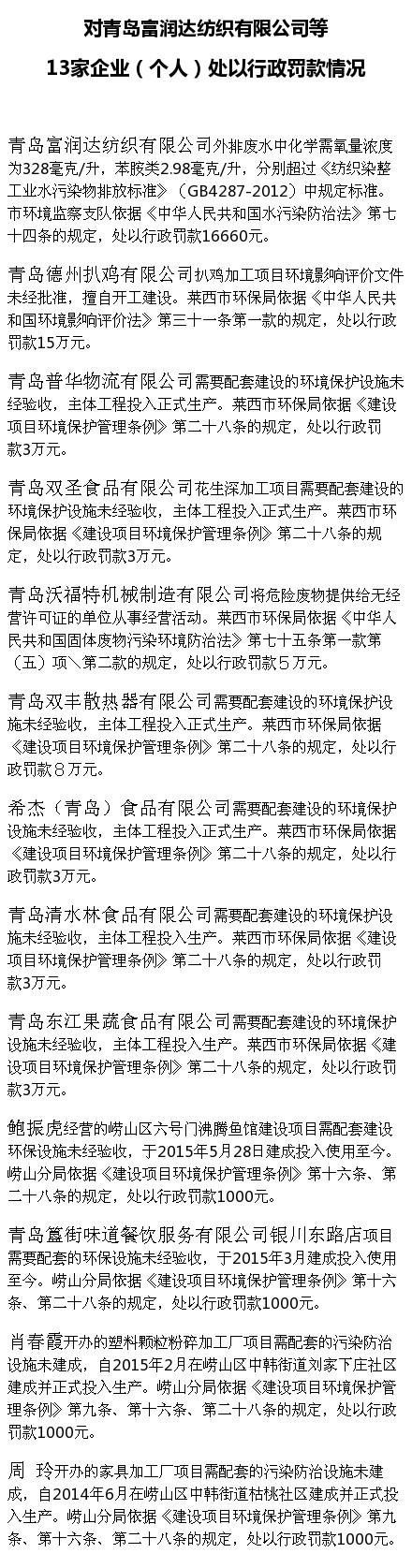 青島環(huán)保局對13家違規(guī)生產(chǎn)的企業(yè)(個人)處以行政處罰情況