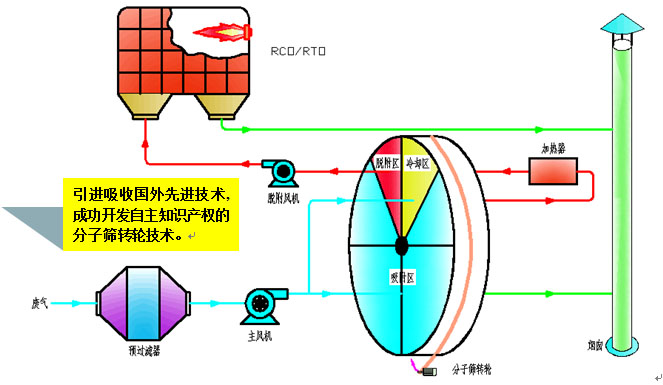 ????????? 分子篩吸附濃縮+熱氧化(RTO/CO)系統(tǒng)工藝流程圖??????????????????????????????????????????????? 核心材料:分子篩轉(zhuǎn)輪