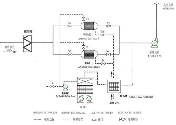 2、如果是成分特別復(fù)雜的工業(yè)有機廢氣,處理的方式為:“吸附+脫附+催化燃燒”工藝。經(jīng)過催化燃燒后的有機廢氣轉(zhuǎn)化為二氧化碳和水直接排放,工藝簡單而且處理效果好,催化燃燒后的預(yù)熱可以再利用。