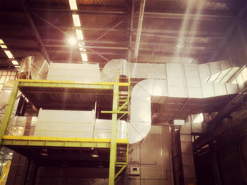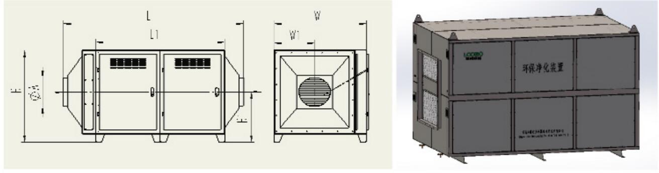 工業(yè)廢氣利用排風(fēng)設(shè)備輸入到凈化設(shè)備后,凈化設(shè)備運用高能UV紫外線光束及臭氧對工業(yè)廢氣進行協(xié)同分解氧化反應(yīng),使工業(yè)廢氣降解轉(zhuǎn)化成低分子化合物、水和二氧化碳,再通過排風(fēng)管道排出室外。