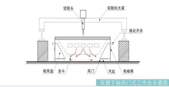 切割平臺(tái)的抽風(fēng)系統(tǒng)有效集中在切割機(jī)所在區(qū)域(寬度為切割平臺(tái)寬度,長(zhǎng)度方向約1m),該區(qū)域隨切割頭移動(dòng)而移動(dòng),有效節(jié)省了抽風(fēng)量。